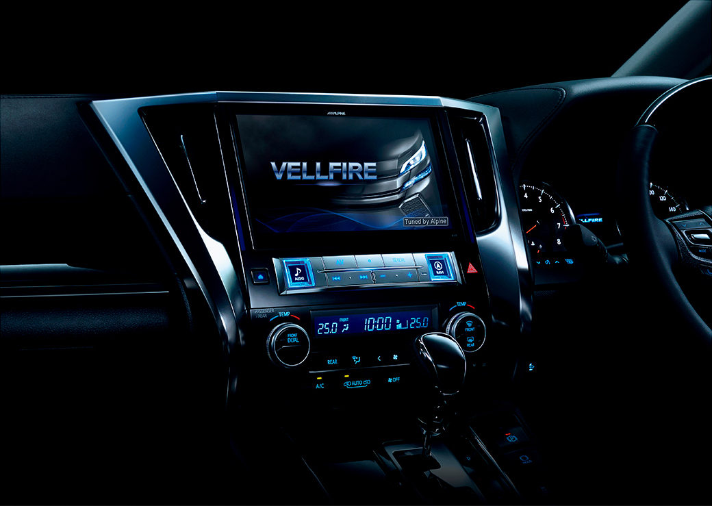その中核を担うカーナビは、当時世界最大サイズとなる10型大画面を搭載したビッグXプレミアムで、アルファード/ヴェルファイア専用モデルとして独自のデザインやチューニングが行われたもの。画面はそれまでのWVGA液晶に比べて2.4倍の高精細を誇るWXGA液晶を採用。またアルファードにはアルファードの、ヴェルファイアにはヴェルファイアのオープニング画面が格納されており、エンジンをかけるたびにそれぞれのオーナーのこだわりに応える演出がなされていた。後席モニターであるリアビジョンは、同じく高精細WXGA液晶で12.8型にまで大型化した、まさにアルファード/ヴェルファイアの大空間にふさわしいモデル。プレミアムサウンドパッケージも、アルファード/ヴェルファイア専用に開発され、内装に美しくインストールされる。もちろん音質は、カーオーディオブランドとして長い歴史を持つアルパインが自信を持って提供するものだ。さらにバックビューカメラのガイド線や、内装に合わせたカーアロマのブルーのライティングなど、こだわりは細部に渡った。