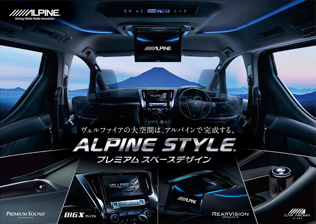 「アルパインスタイル プレミアムスペースデザイン」とは、アルパインの大画面カーナビ「ビッグX」、後席モニター「リアビジョン」、「プレミアムサウンドシステム」、「バックビューカメラ」、そして「カーアロマ」等による車種専用製品のトータルな構成によって、より上質な車内空間をお客様に提供するという新しいコンセプトだ。見て、触って、聴いて、さらに香りの要素を含めて五感で喜びを感じて、より満足度の高いカーライフを楽しんでもらうのが狙いだ。この「アルパインスタイル プレミアムスペースデザイン」を、日本を代表する最高級ミニバンであり、あらためて大空間高級サルーンとして生まれ変わったアルファード/ヴェルファイアにおいて、まず叶えたのである。