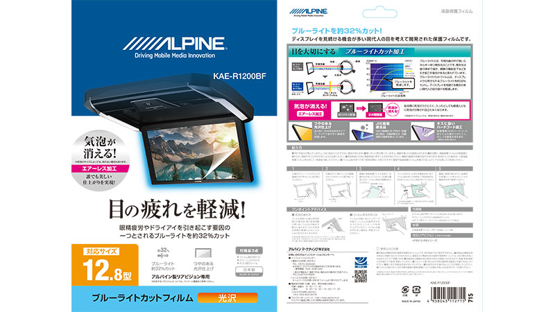 リアビジョンの長時間視聴対策に。ブルーライトカットフィルム サイズ(mm) 284. 0×160. 1 【ブルーライト約32%カット】 青色光をカットし、液晶画面を長時間視聴した時の目の疲れを軽減します。 【美しい仕上がりエアーレス加工】 フィルムを貼る際に気泡が入っても、時間とともに分散し目立たなくなります。 ※気泡のサイズによっては消えない場合もあります。 【クリアで見やすい光沢仕上げ】 ほどよくつやのある光沢タイプで、クリアで見やすい画面を実現します。