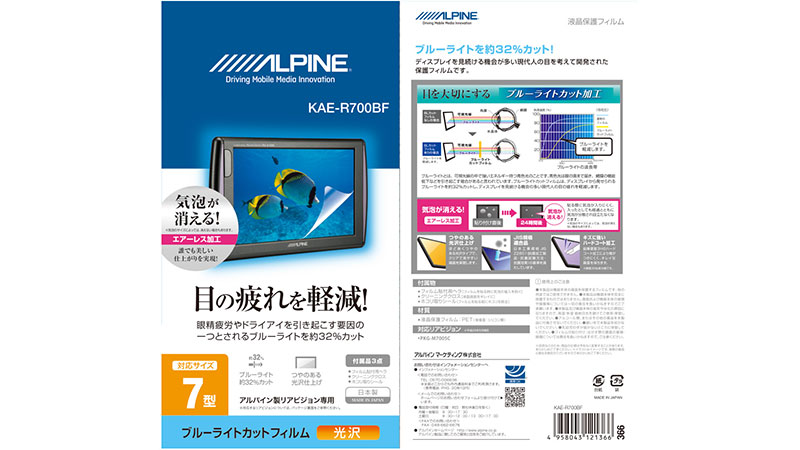 リアビジョンの長時間視聴対策に。ブルーライトカットフィルム サイズ(mm)153.4×86.4 【ブルーライト約32%カット】 青色光をカットし、液晶画面を長時間視聴した時の目の疲れを軽減します。 【美しい仕上がりエアーレス加工】 フィルムを貼る際に気泡が入っても、時間とともに分散し目立たなくなります。 ※気泡のサイズによっては消えない場合もあります。 【クリアで見やすい光沢仕上げ】 ほどよくつやのある光沢タイプで、クリアで見やすい画面を実現します。