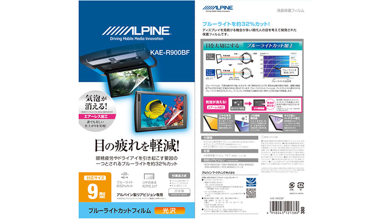 リアビジョンの長時間視聴対策に。ブルーライトカットフィルム サイズ(mm)197.0×111.1 ※PXH9S-R-Bには対応しておりません。 【ブルーライト約32%カット】 青色光をカットし、液晶画面を長時間視聴した時の目の疲れを軽減します。 【美しい仕上がりエアーレス加工】 フィルムを貼る際に気泡が入っても、時間とともに分散し目立たなくなります。 ※気泡のサイズによっては消えない場合もあります。 【クリアで見やすい光沢仕上げ】 ほどよくつやのある光沢タイプで、クリアで見やすい画面を実現します。