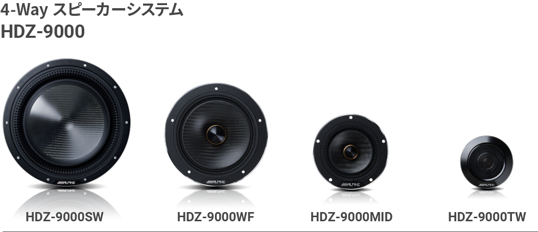 「音色の統一を追求し、チューニング幅を広げた4-Wayシステム」従来、スピーカー・ユニットは各再生帯域のユニットごとに、最適な素材と構造を採り入れてきました。しかし、この方法では各ユニットの特性が異なるため、ユニットごとの音色に微細な違いが生じていました。それに対してAlpineF#1Statusでは、素材と構造を統一することで各ユニットの音色を美しくそろえることに挑戦しました。 そして数えきれない試行錯誤を繰り返し、たどり着いた回答が軽さと硬さを兼ね備えた炭素繊維強化樹脂「CFRP」の採用です。これは、同じ質量でスチールの5~6倍、アルミの3~4倍の強度を持つ素材で、航空用途や業務用ビデオカメラのボディなどに使われています。民生用としてはたいへん高価ですが音色を統一する素材として理想的なものと判断し、今回全ユニットに採用しました。