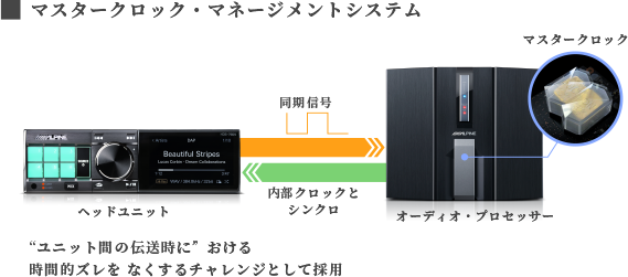 現時点でハイレゾ最高SPECである「384kHz/32bit」を再生するにあたっては、わずかなジッターの影響はさらに見逃せない要素となって参ります。 そこで、AlpineF#1Statusには、オーディオ・プロセッサーに世界最高精度で発振させたクロックを「マスタークロック」としてヘッドユニットに送り、完全に信号処理を同期させる「マスタークロック・マネージメントシステム」を開発し、搭載しました。