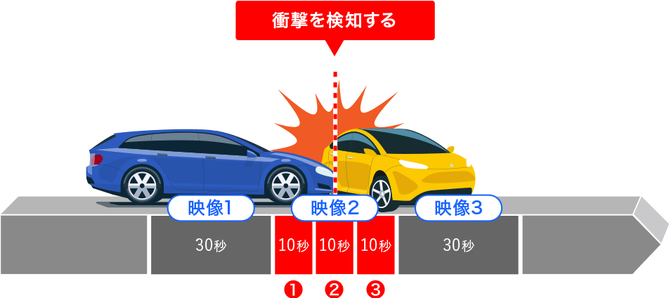 駐車モードはエンジンオフの30秒後から有効となります。駐車モード中に衝撃検知した時に、