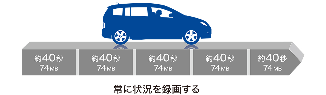 イグニッションキーをオンにすると常時録画を開始。常時録画中は常に映像を保存し続けます。マイクロSDカードの容量がいっぱいになると古いデータから上書きして録画を続けます。
