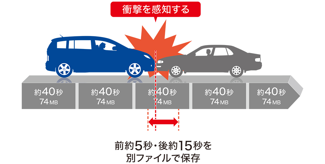 常時録画中または駐車モード中に衝撃を感知すると、その前後の映像を別ファイルとして保存します。保存が終わると常時録画または駐車モードに戻ります。