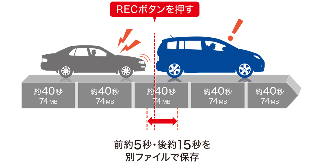 リモコン操作で万が一の時にも素早く対応。常時録画中に本体の録画ボタンまたはリモコンの録画ボタンを押すと、その前後の映像を別ファイルとして保存します。保存が終わると常時録画に戻ります。
