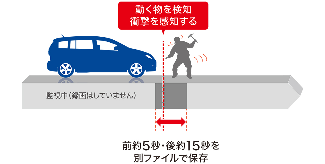 駐車場などに車を停めているエンジンオフ時に動体または衝撃を検知すると、前後の映像を別ファイルとして保存します。盗難防止のセキュリティ機能として安心です。