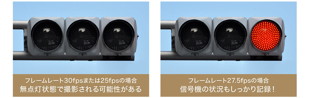 LED信号機特有の点滅周期に影響されず、信号機の状況をしっかりと記録します。