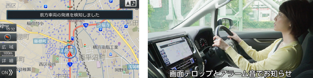 前方発進通知時に、前の車が発進したことをナビ画面にテロップ表示できます。