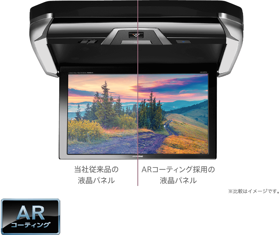 可能な限り心地よく映像をお楽しみいただきたいから。リアビジョンの液晶パネルには反射やにじみの元となるゴーストの発生を抑える「ARコーティング」を採用(注2)。引き締まった黒の再現により、映像の美しさがより際立ちます