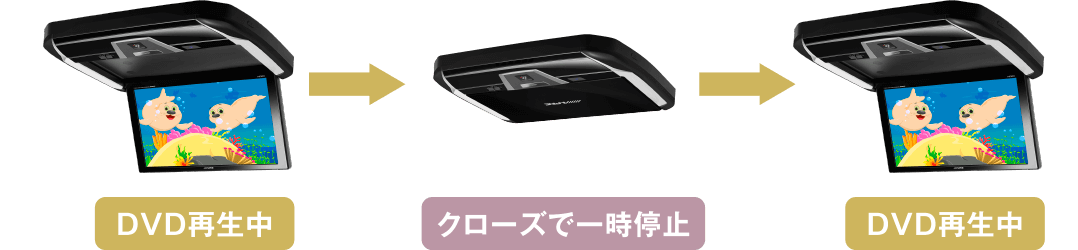 カーナビ側で操作しなくても、モニターを閉じれば動画の一時停止が可能です。また長時間視聴対策に一定時間で自動一時停止する「休憩モード」も搭載。休憩タイムの後は続きのシーンから再生。家族のロングドライブにうれしい機能です。