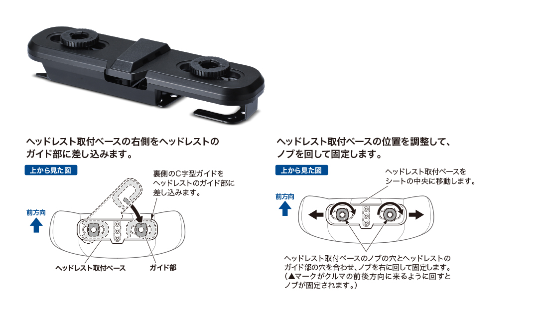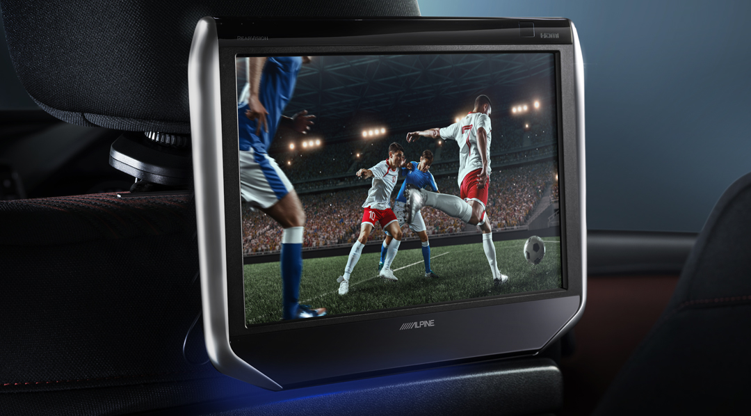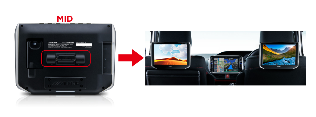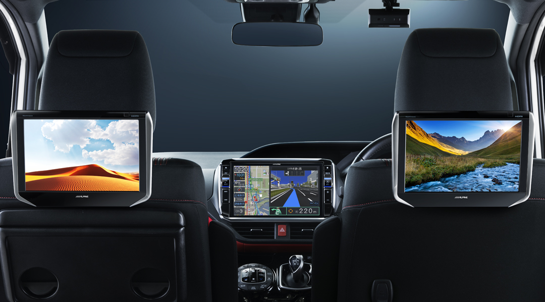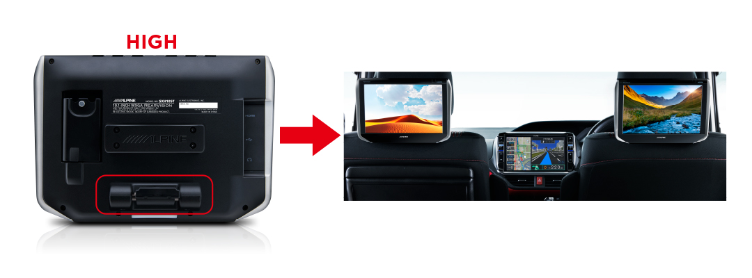 フロントシート背面に専用取付けキットで装着。上下2段階の高さでモニターの固定が可能です。10.1型WXGA液晶搭載のヘッドレスト取付け型リアビジョン2台パックです。アルパインカーナビとのHDMI接続により2台がそれぞれ個別に映像を楽しめます。